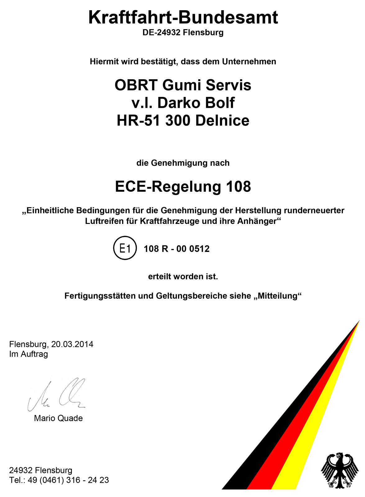 Glavna djelatnost obrta je protektiranje guma, za što posjedujemo certifikat ECE-REGULTING-108, E1 R-00 0512 koji je izdan od strane njemačkog ministarstva prometa. Navedeni certifikat omogućuje korištenje naših guma u svim zemljama Europe.